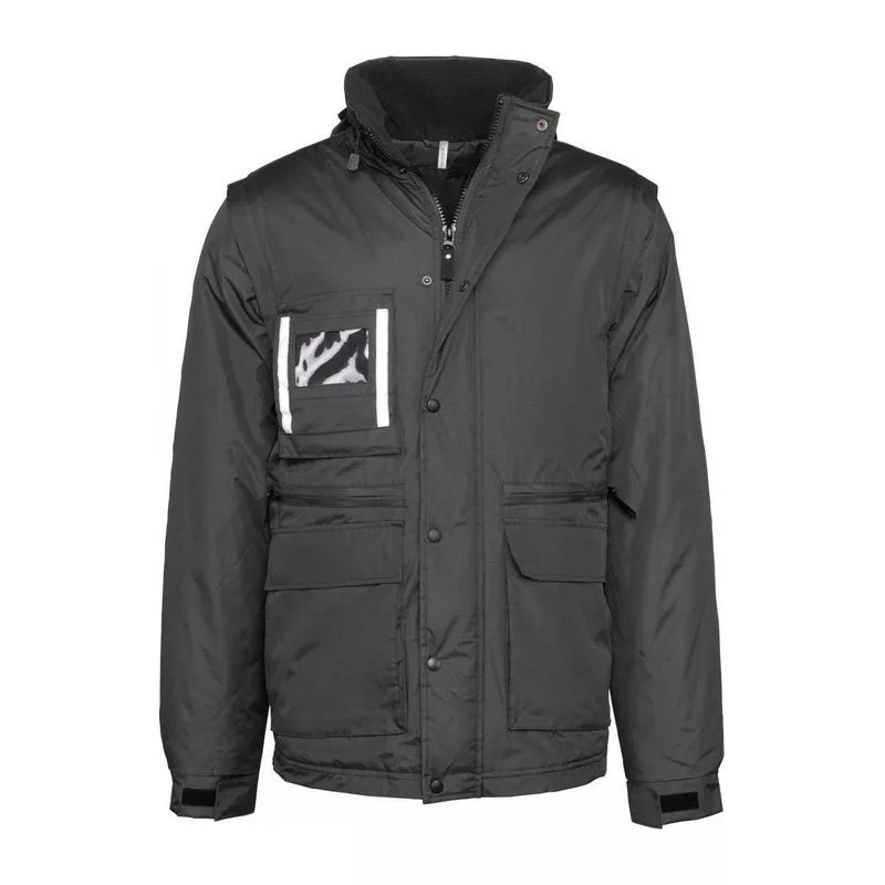 PVC coated 100% polyester ripstop outer;Fully padded;Fleece lined back and inner collar;Full front zip with studded flap;Detachable sleeves;5 functional front pockets including 1 for badge holder;1 inner pocket;Reflective trims on chest and back;Reinforced shoulder panels;Side zip opening for ease of movement;Ajdustable drawcord at waist;Concealed hood;Zip access for decoration at chest and hem;
