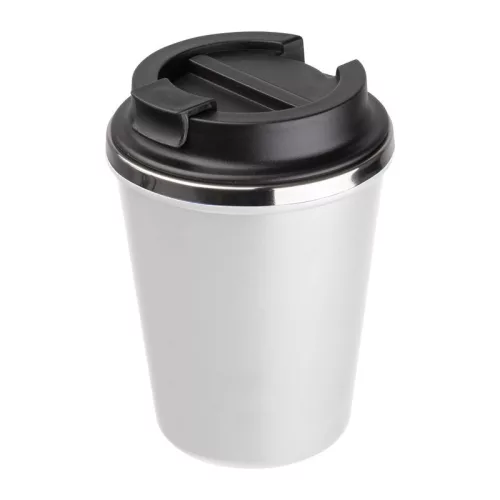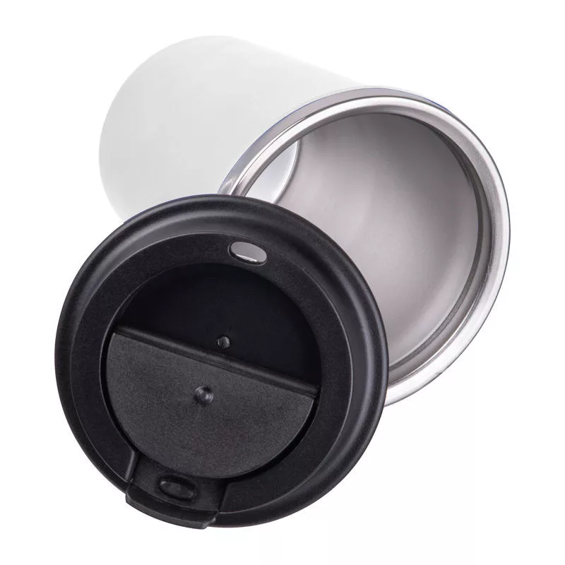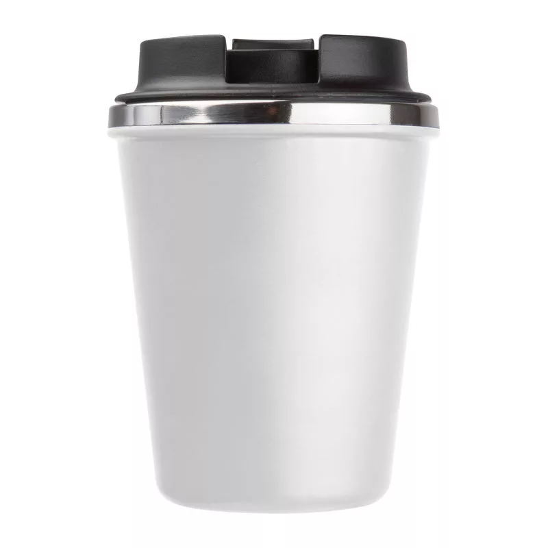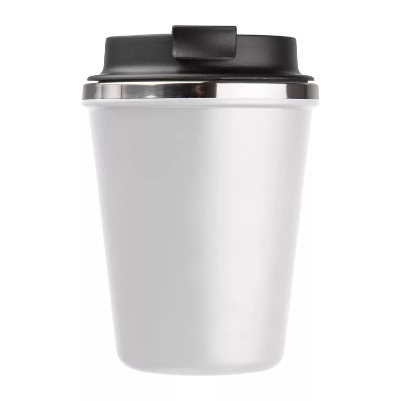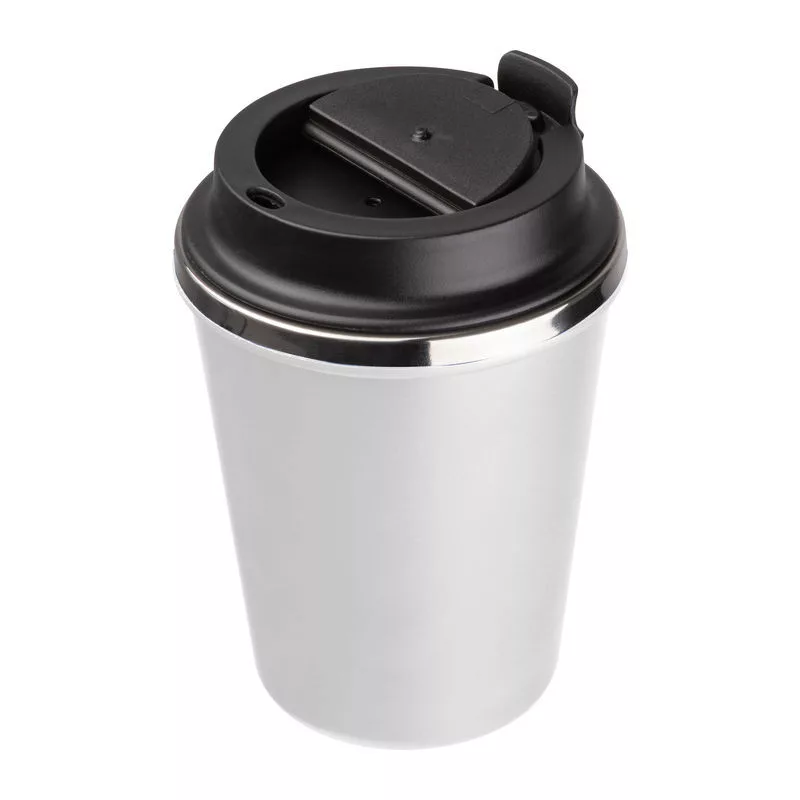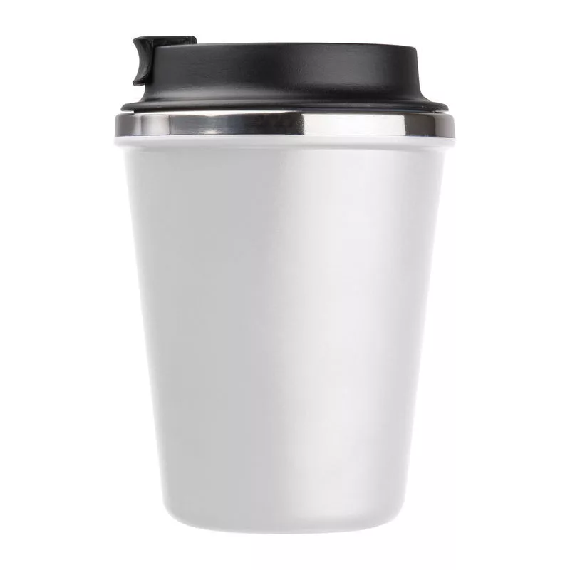 Elegáns, duplafalú vákuumos termosz pohár rozsdamentes acél belsővel és újrahasznosított műanyag külsővel. 350 ml-es űrtartalommal és szivárgásmentes csavaros kupakkal.