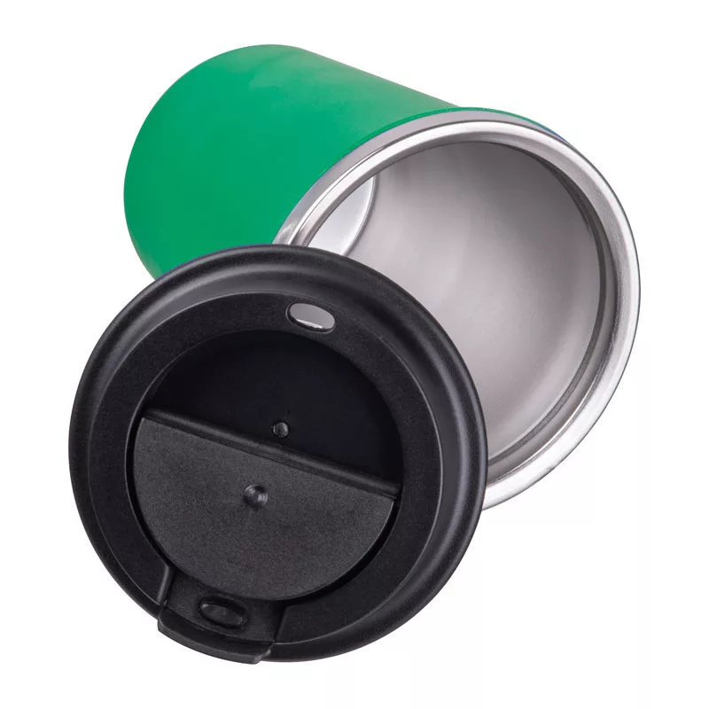 Elegáns, duplafalú vákuumos termosz pohár rozsdamentes acél belsővel és újrahasznosított műanyag külsővel. 350 ml-es űrtartalommal és szivárgásmentes csavaros kupakkal.