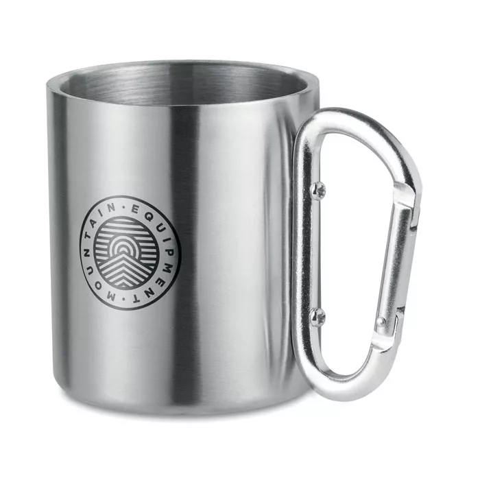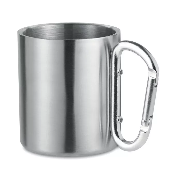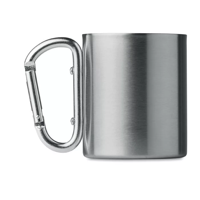 Duplafalú rozsdamentes acél bögre. Nagyméretű karabiner füllel. Űrtartalom: 220 ml.