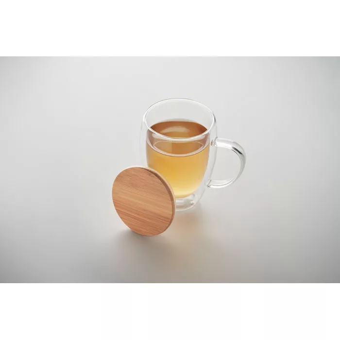 Duplafalú boroszilikát üveg bögre bambusz fedéllel. Űrtartalom: 250 ml.