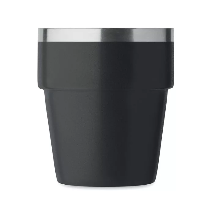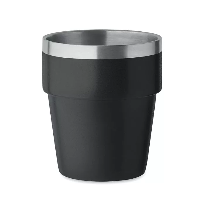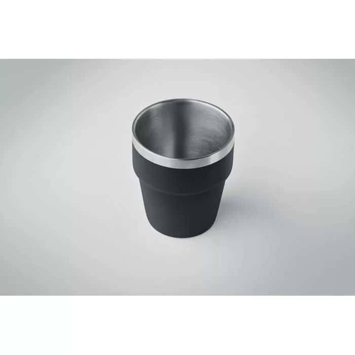 Duplafalú pohár újrahasznosított rozsdamentes acélból (90% újrahasznosított rozsdamentes acél és 10% rozsdamentes acél). Rakásolható. Űrtartalom: 250 ml.