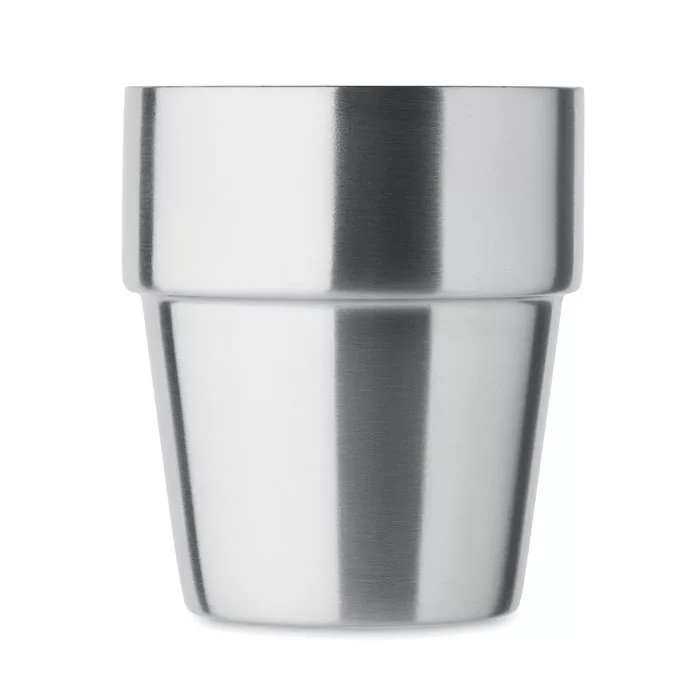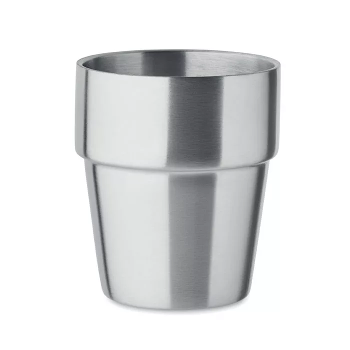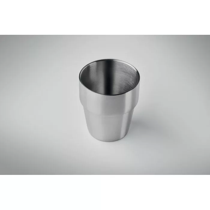 Duplafalú pohár újrahasznosított rozsdamentes acélból (90% újrahasznosított rozsdamentes acél és 10% rozsdamentes acél). Rakásolható. Űrtartalom: 250 ml.