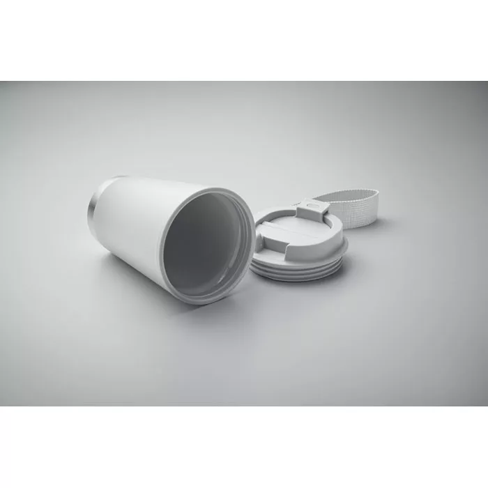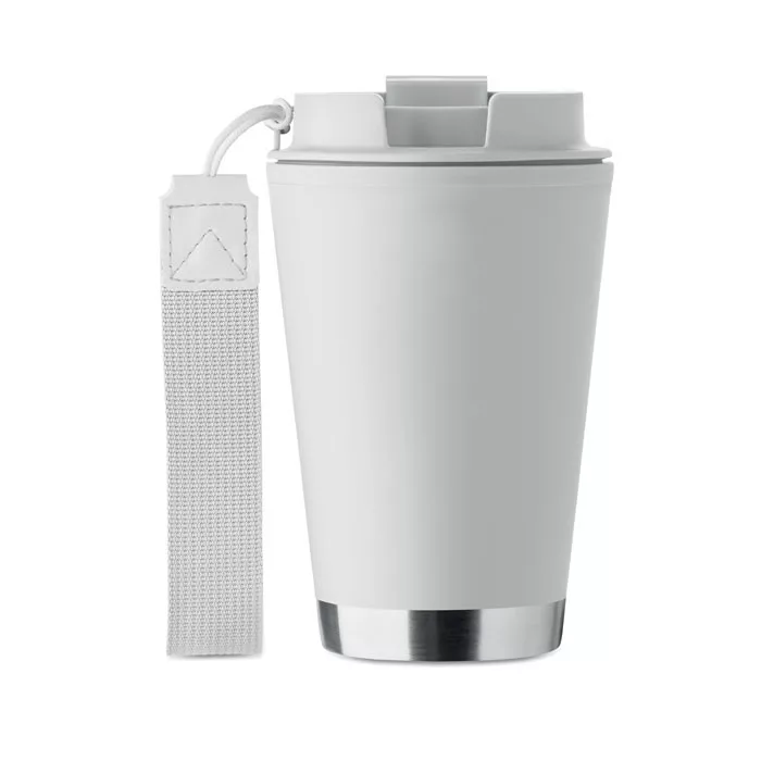 Duplafalú pohár PP belső- és újrahasznosított PP külső fallal, újrahasznosított rozsdamentes acél részlettel az alján, RPET csuklópánttal. Űrtartalom: 300 ml.szivárgásmentes.