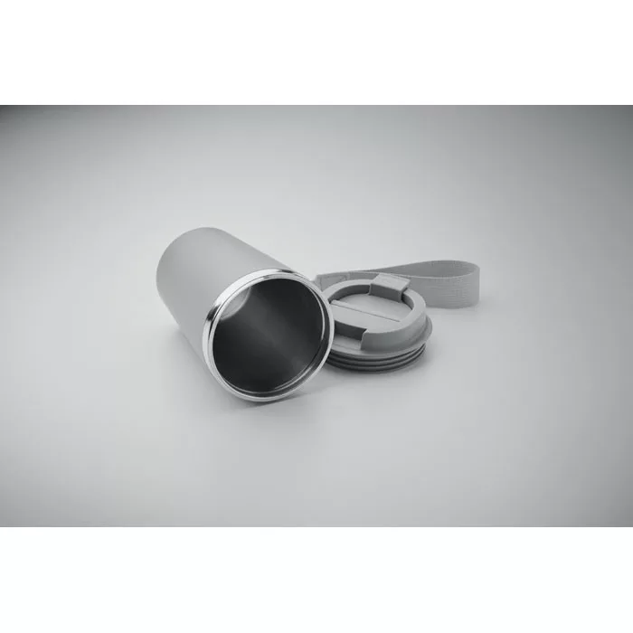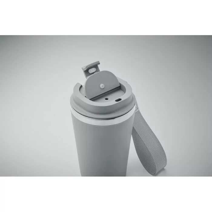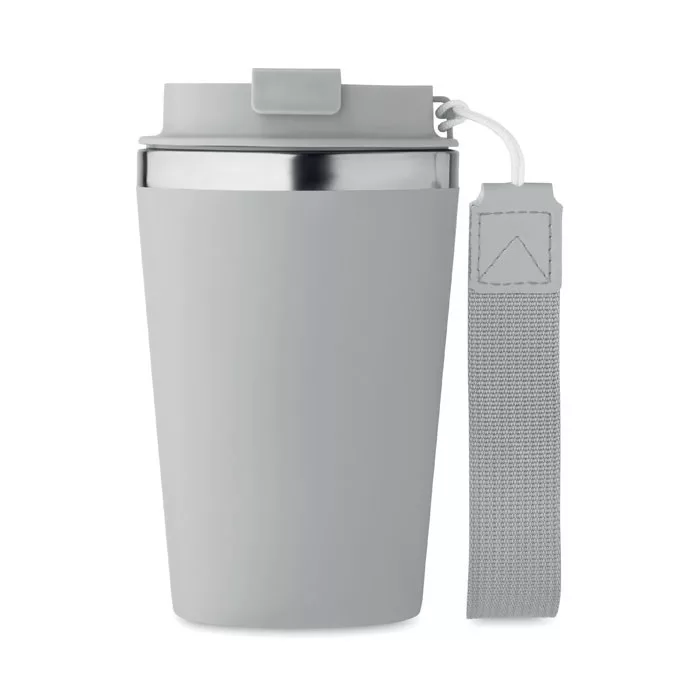Duplafalú pohár újrahasznosított rozsdamentes acélból (90% újrahasznosított rozsdamentes acél és 10% rozsdamentes acél), PP külső réteggel, RPET csuklópánttal. Űrtartalom: 350 ml.