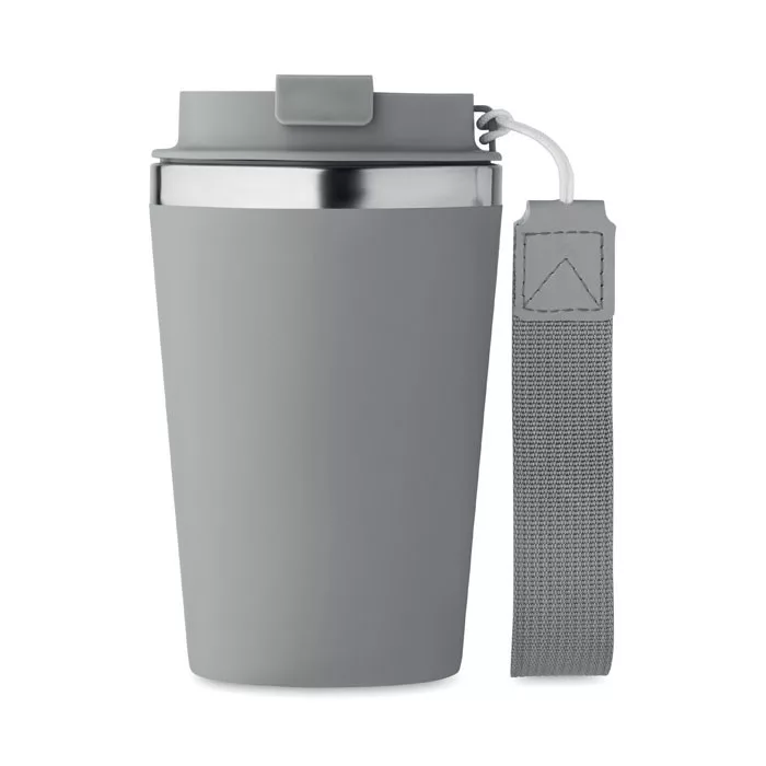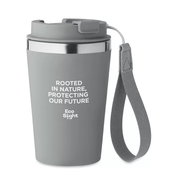 Duplafalú pohár újrahasznosított rozsdamentes acélból (90% újrahasznosított rozsdamentes acél és 10% rozsdamentes acél), PP külső réteggel, RPET csuklópánttal. Űrtartalom: 350 ml.