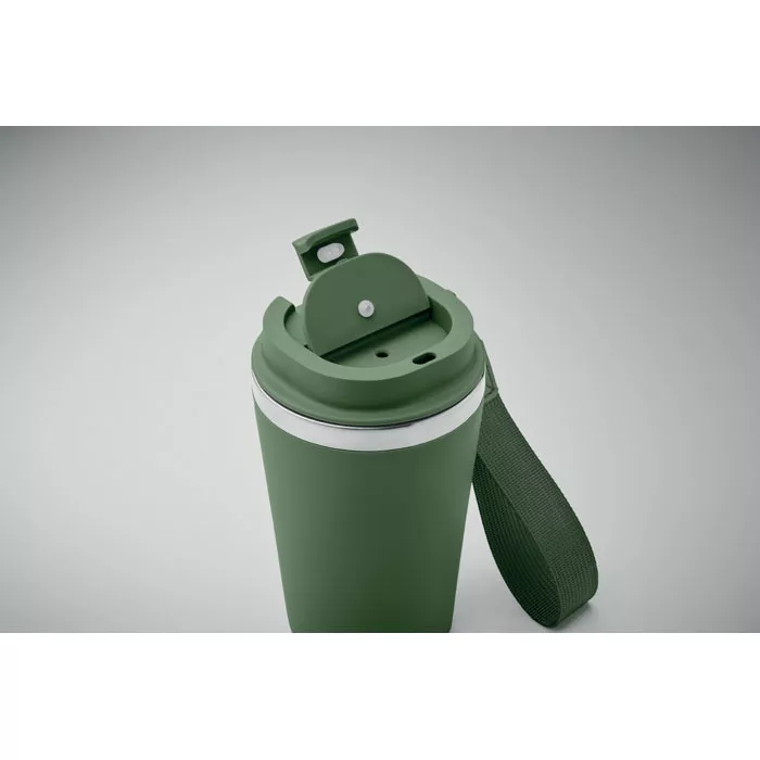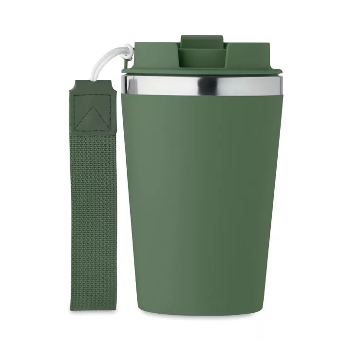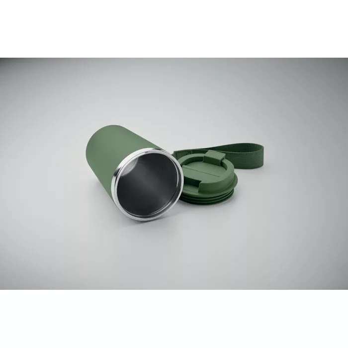 Duplafalú pohár újrahasznosított rozsdamentes acélból (90% újrahasznosított rozsdamentes acél és 10% rozsdamentes acél), PP külső réteggel, RPET csuklópánttal. Űrtartalom: 350 ml.
