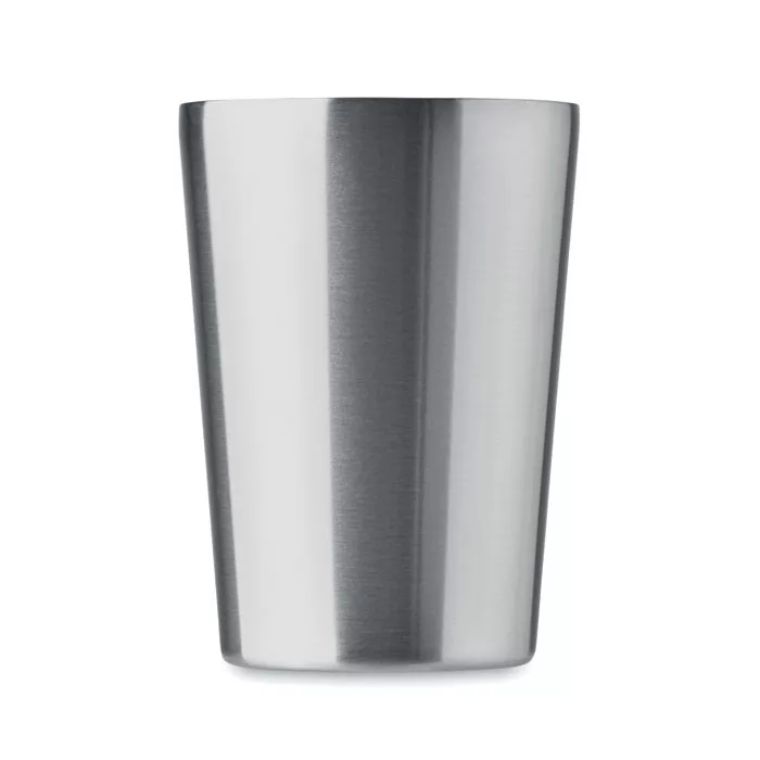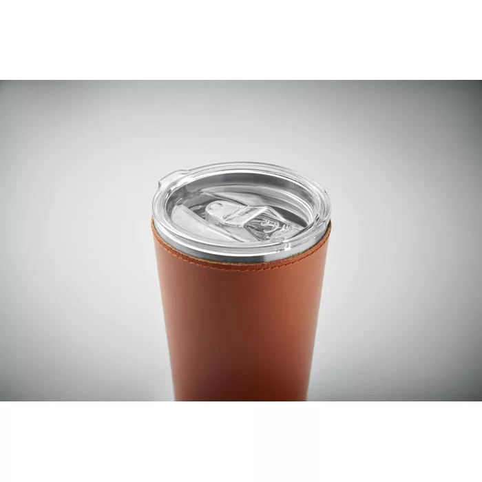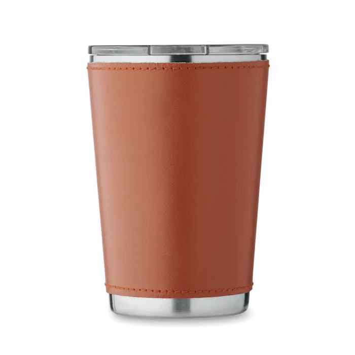 Duplafalú pohár újrahasznosított rozsdamentes acélból (90% újrahasznosított rozsdamentes acél és 10% rozsdamentes acél), levehető PU bőr tokkal. Fedél csúsztatható ivónyílással. Szivárgásmentes. Űrtartalom: 350 ml.