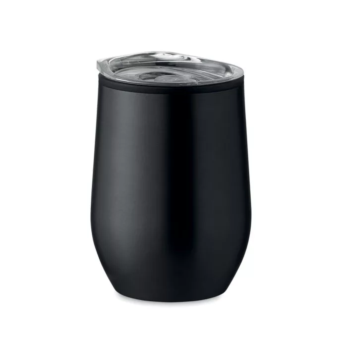 Duplafalú rozsdamentes acél pohár PP belső résszel és átlátszó PS fedéllel. Űrtartalom: 350 ml.