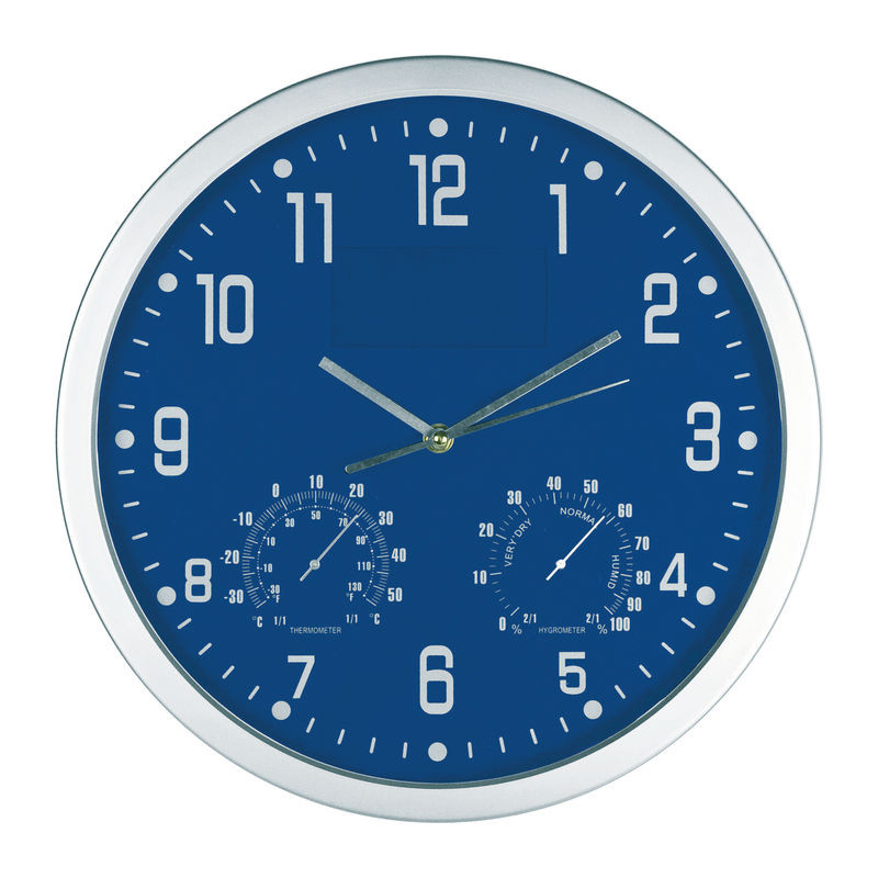 Elegáns és egyszerű - ezáltal ideális reklámhordozó ez a falióra hőmérővel és higrométerrel.