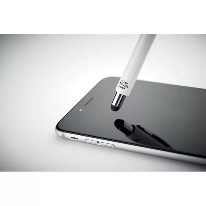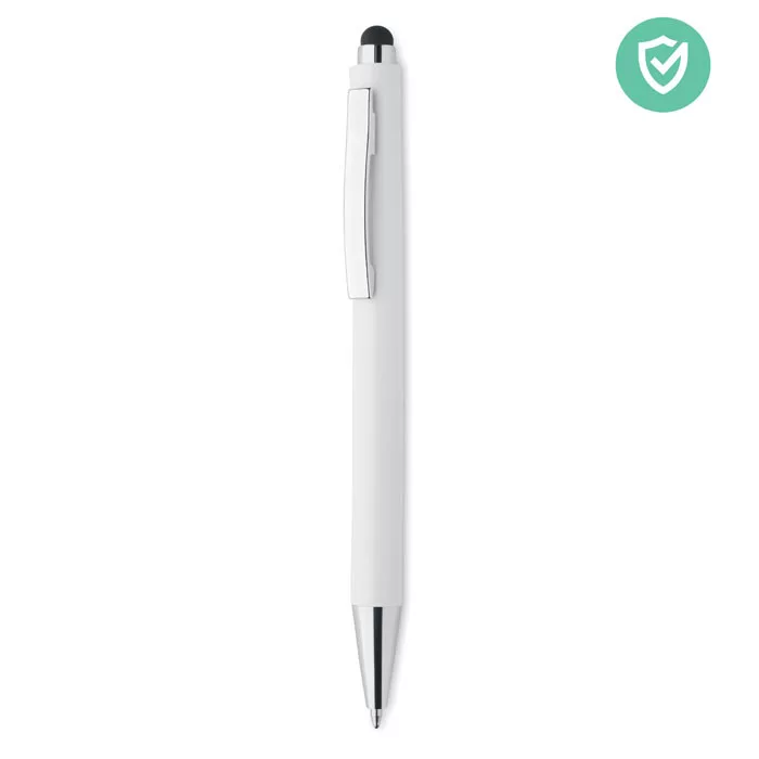Nyomógombos érintőceruzás golyóstoll ABS műanyag, antibakteriális tolltesttel. Ez a toll speciális adalékot (nano ezüstöt) tartalmazó, antibakteriális tolltesttel rendelkezik, amely megakadályozza, hogy baktériumok telepedjenek meg a toll felületén. Az érintőceruzával egyszerűen kezelheti az érintőképernyőket anélkül, hogy hozzájuk kellene érnie. ISO 22196. A toll kéken író betétet tartalmaz.