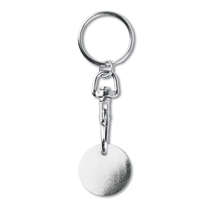 Bevásárlókocsi érmés kulcstartó, EUR méret. Fémből készült, az elején zománcozott bevonattal. Az érme mérete Ø23,2 x 2,1 mm vastag.