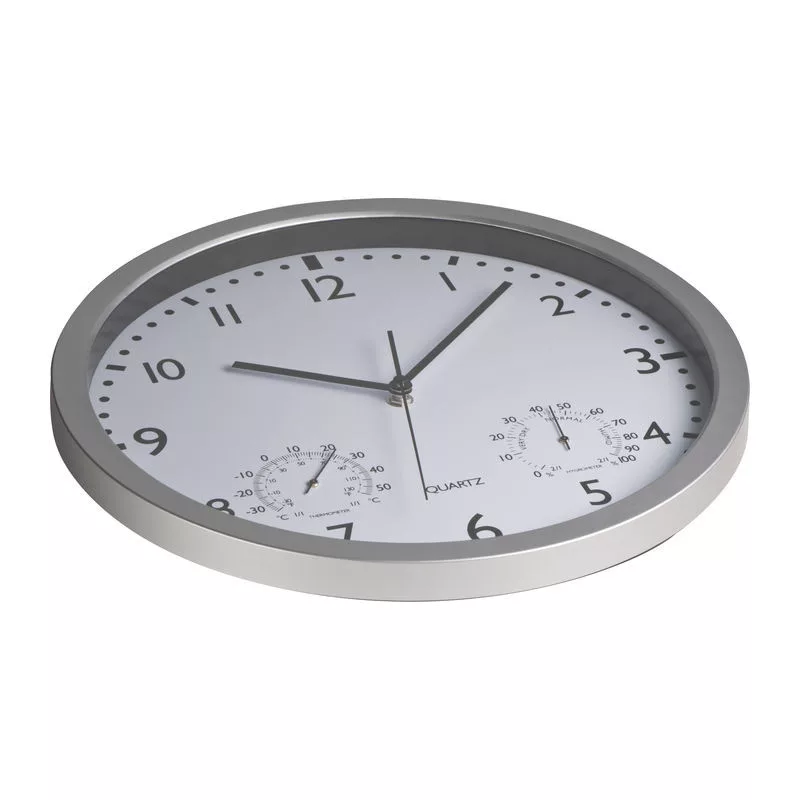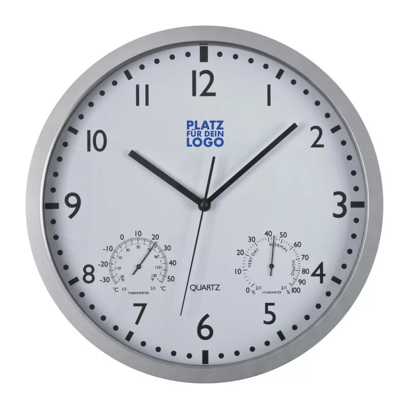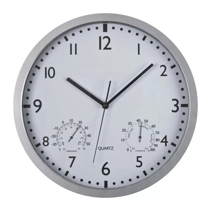 Klasszikus falióra hőmérővel és higrométerrel. A bajonettzárnak köszönhetően a számlap egyszerűen kivehető az óra keretből.