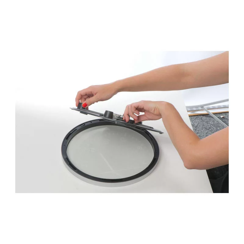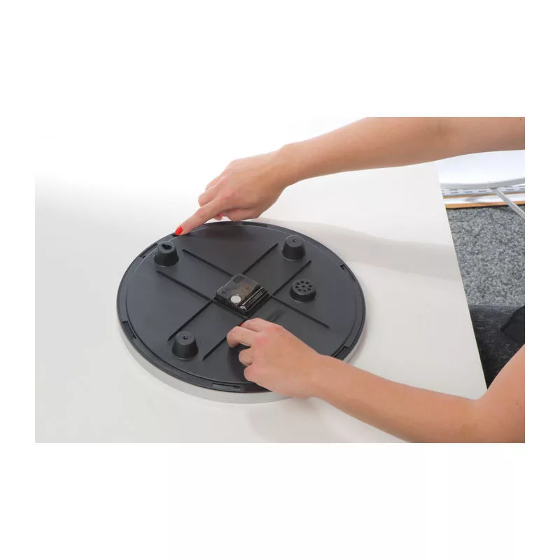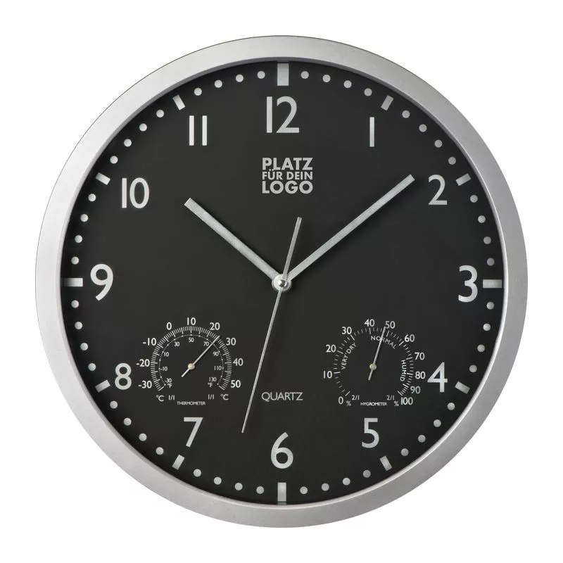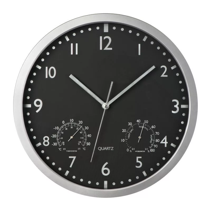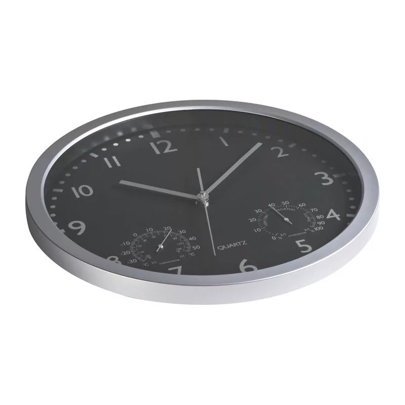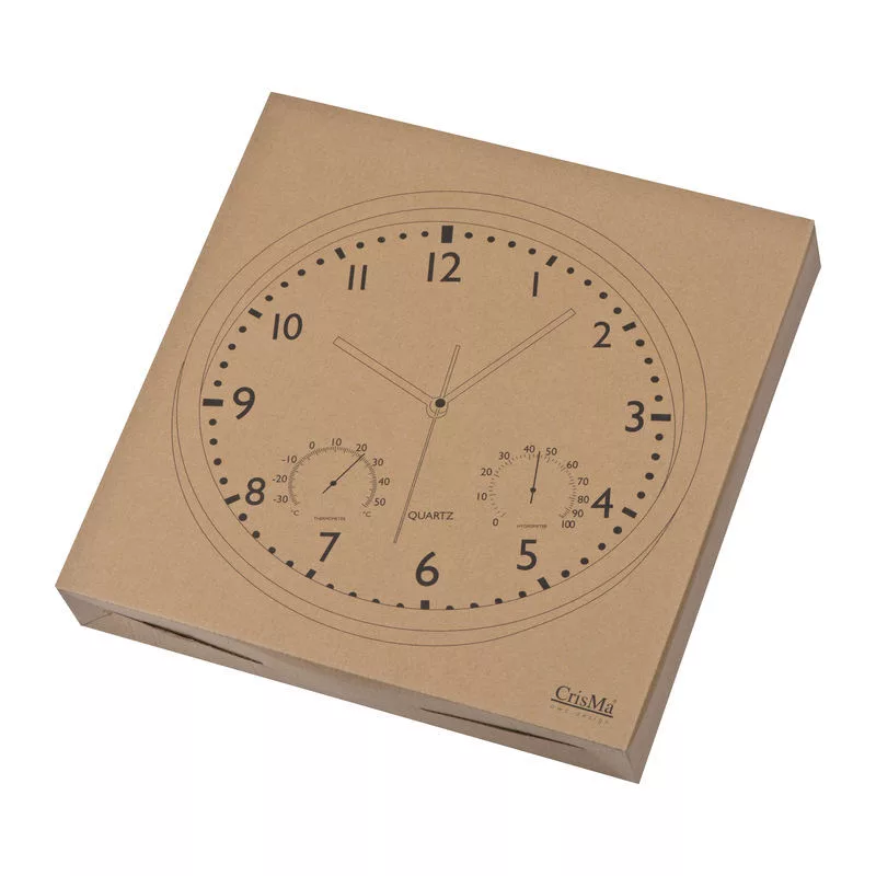 Klasszikus falióra hőmérővel és higrométerrel. A bajonettzárnak köszönhetően a számlap egyszerűen kivehető az óra keretből.