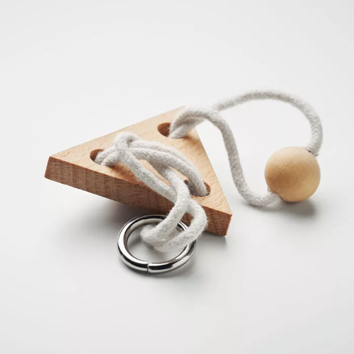 Fából készült, háromszög alakú fejtörő ördöglakat. Újrahasznosított papírdobozban. A fa természetes anyag, termékenként szín- és méretbeli eltérések jelentkezhetnek, ami befolyásolhatja a dekoráció végső eredményét.