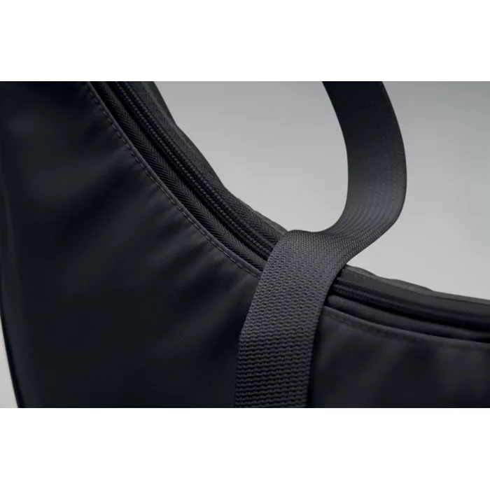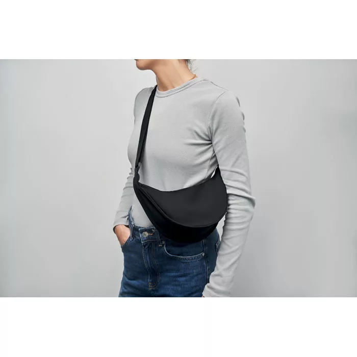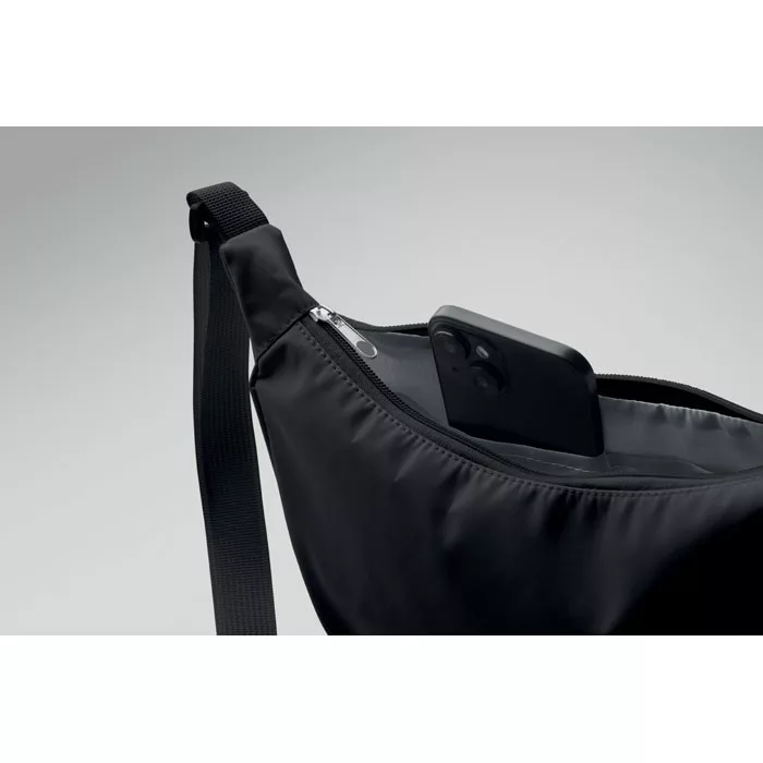 Keresztpántos, félhold alakú táska 400D oxford anyagból, 210D RPET béléssel. Egy cipzáras fő rekesz, 2 belső zseb.