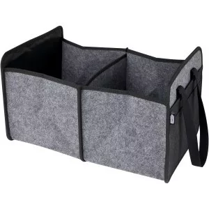 Puha és tartós, kiváló minőségű, GRS tanúsítvánnyal rendelkező újrahasznosított filcből készült összecsukható táska. 2 nagy rekesszel, megerősített alsó lapokkal, elülső zsebbel, hálós zsebbel és 2 hosszú szövött pamut füllel (30 x 2,5 cm). Ideális elektromos járműve töltőkábeleinek tárolására, élelmiszerek szállítására vagy egyszerűen a rend fenntartására az autóban vagy otthon. Minden erőfeszítés nélkül a helyére hajtható, és egy rugalmas pánt gondoskodik arról, hogy szépen összecsukva maradjon. Zárt mélység: 4,5 cm. Nyitott mélység: 48 cm.