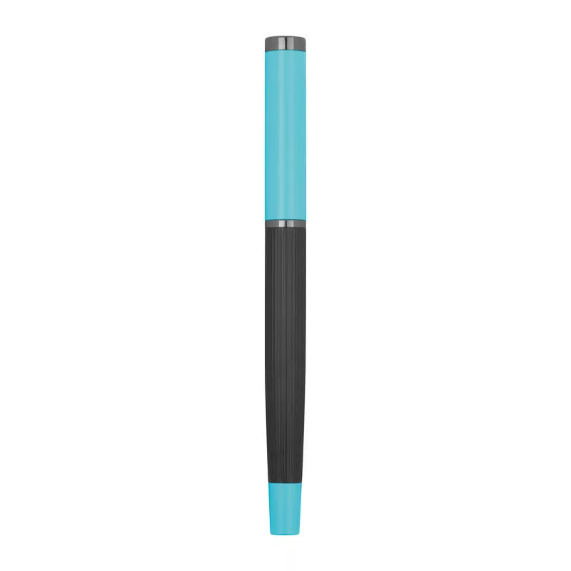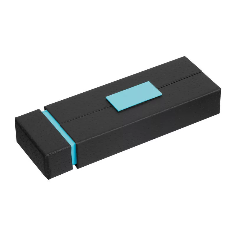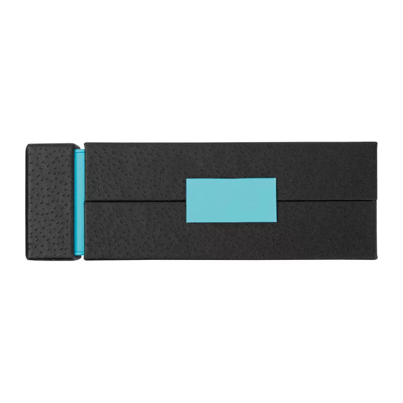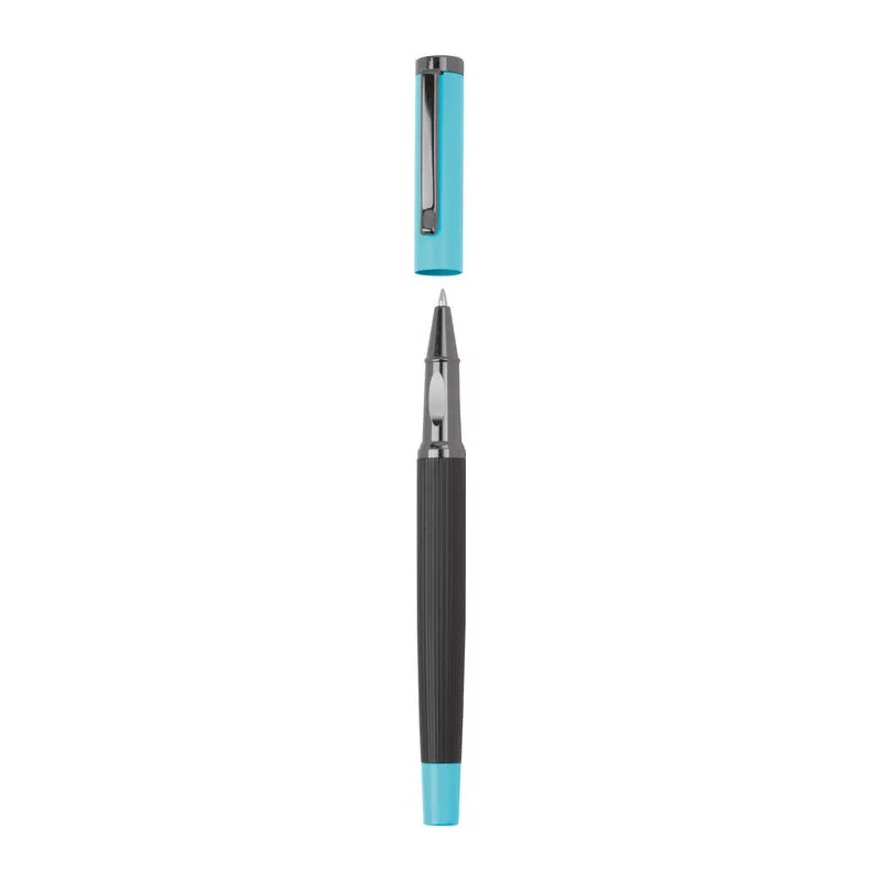 Kék tintás fém toll szett golyóstollal (800 m íráshossz) és rollertollal (500 m íráshossz), színben harmonizáló kihajtható dobozban.