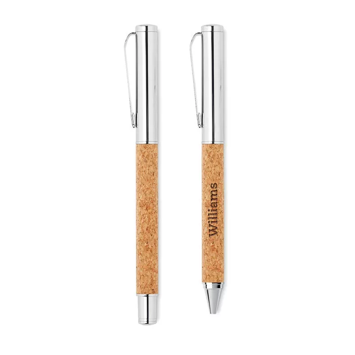 Fém tollkészlet csavarmechanikás golyóstollal és kupakos roller tollal, parafa tolltesttel, hozzá illő parafa ajándékdobozban. A golyóstoll kék, a roller feketén író betéttel. A parafa természetes anyag, szerkezeti jellege és felületi porozitása miatt az egyes tárgyak végső emblémázási eredménye eltéréseket mutathat.