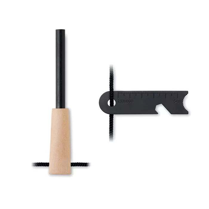 Tűzgyújtó szerszám fenyőfából és rozsdamentes acélból, szikravető rúddal, többcélú kaparóval, üvegnyitóval, mini vonalzóval és csavarkulccsal.