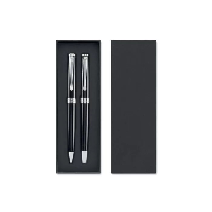 Csavarzáras golyóstollból és roller tollból álló szett újrahasznosított rozsdamentes acél tolltesttel. Kéken, illetve feketén író betéttel. Ajándékdobozban.