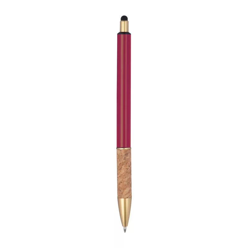 Fém érintőképernyős golyóstoll aranyszínű kiegészítőkkel, kék színű tollbetéttel és parafa markolattal.