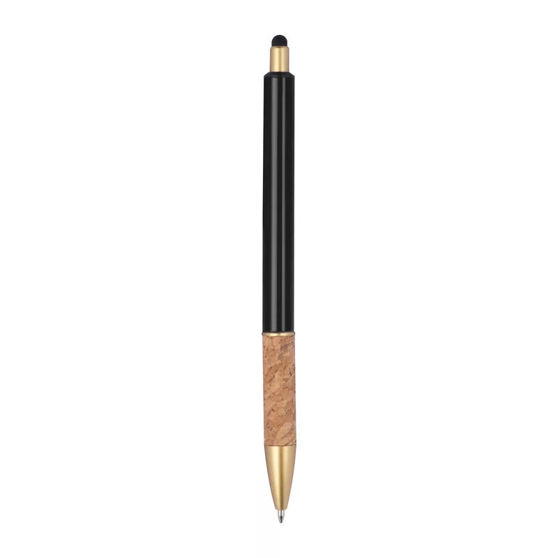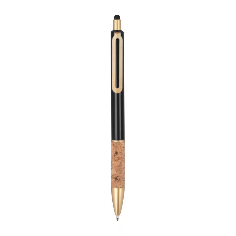 Fém érintőképernyős golyóstoll aranyszínű kiegészítőkkel, kék színű tollbetéttel és parafa markolattal.