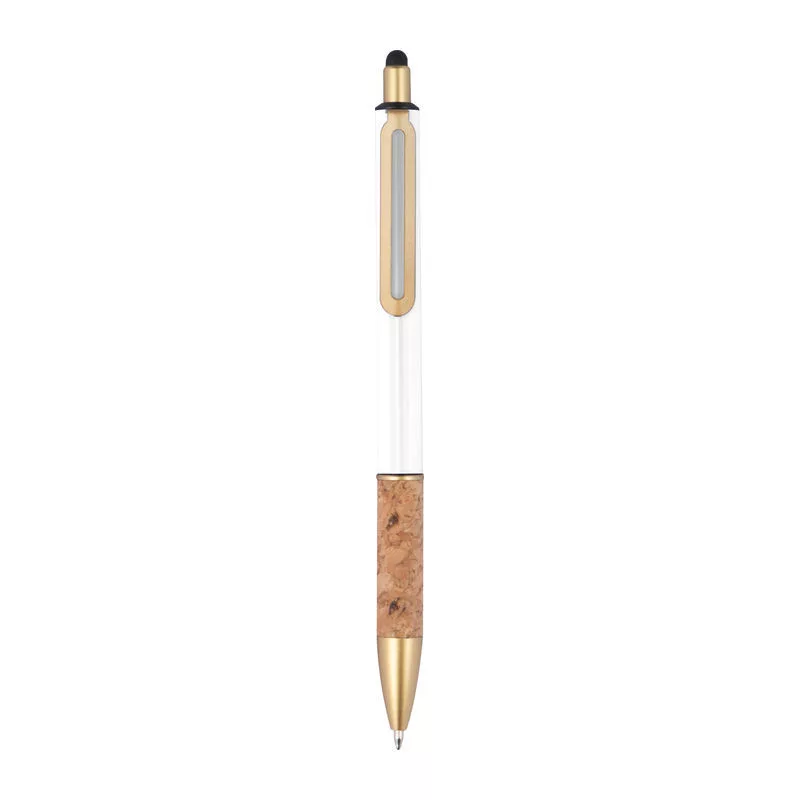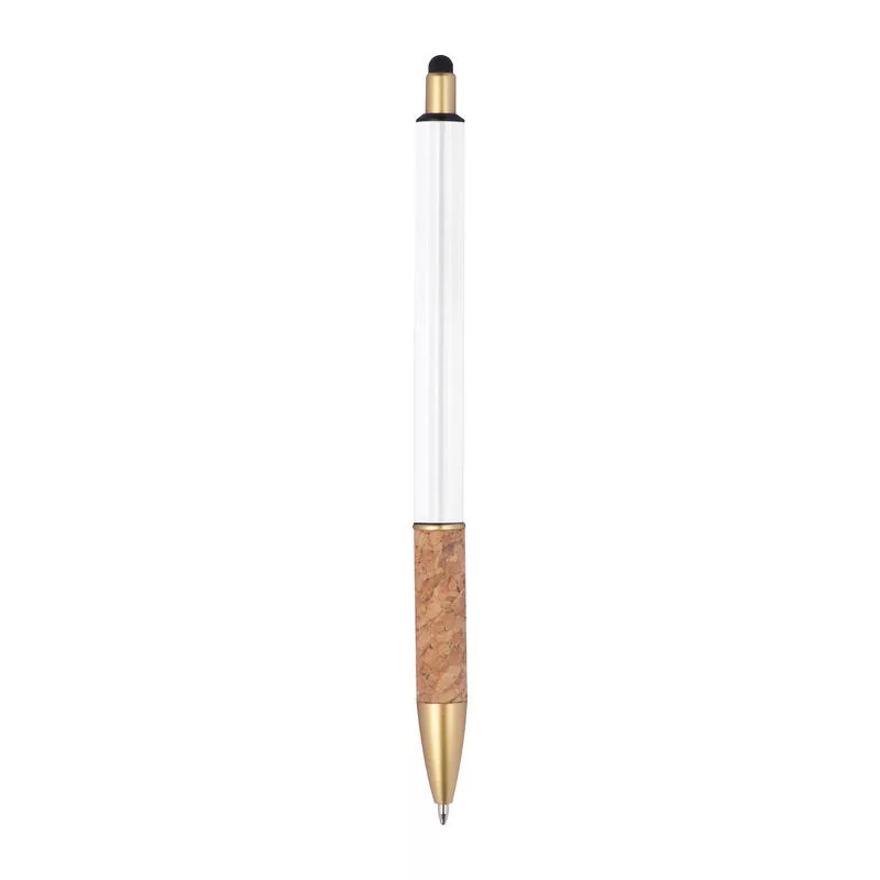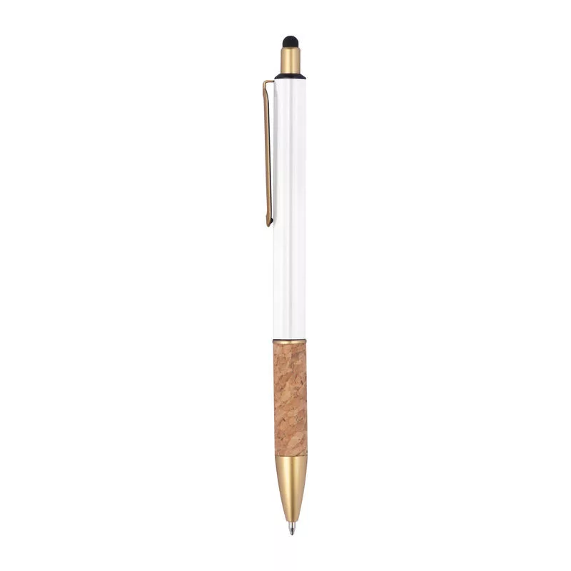 Fém érintőképernyős golyóstoll aranyszínű kiegészítőkkel, kék színű tollbetéttel és parafa markolattal.