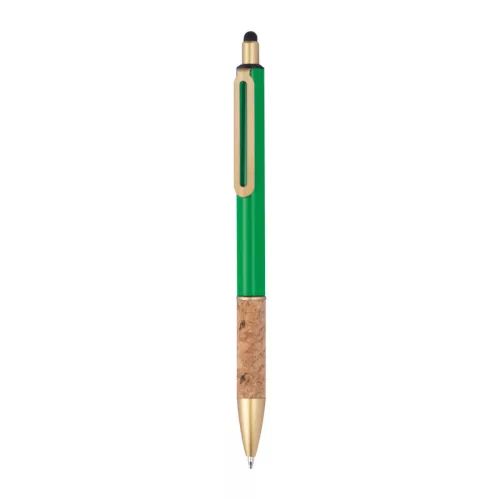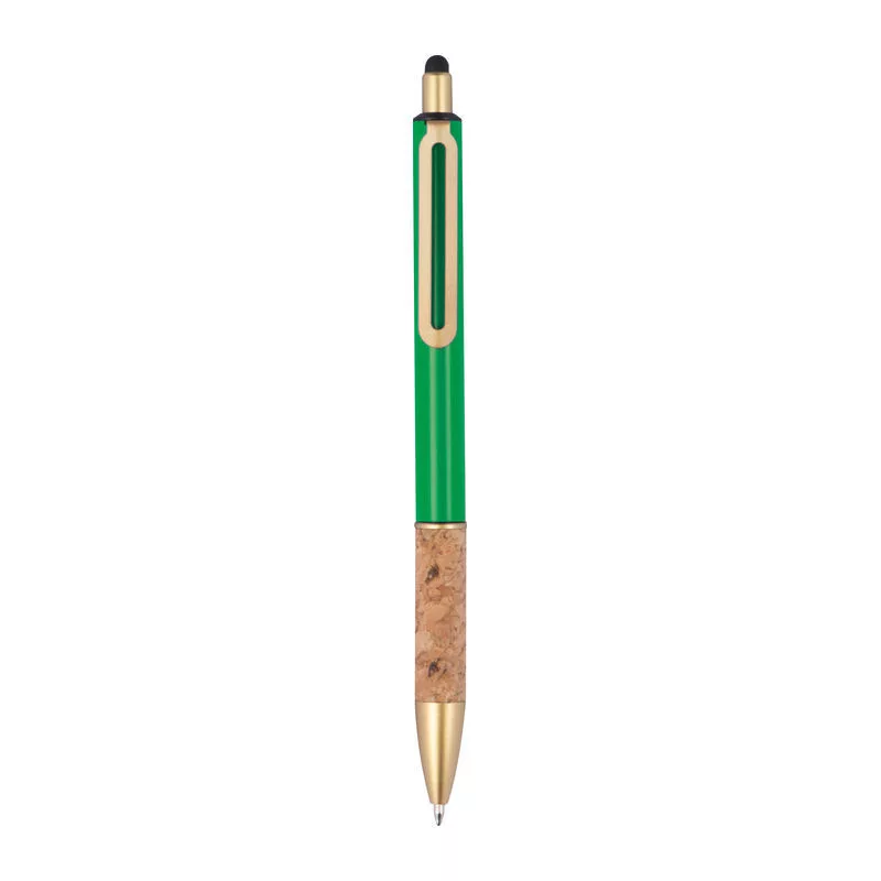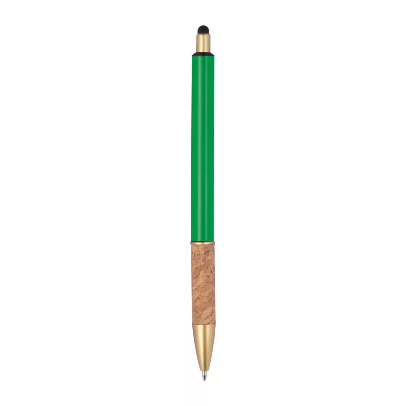 Fém érintőképernyős golyóstoll aranyszínű kiegészítőkkel, kék színű tollbetéttel és parafa markolattal.
