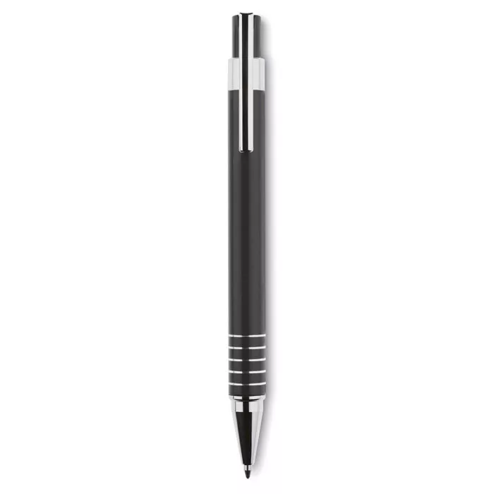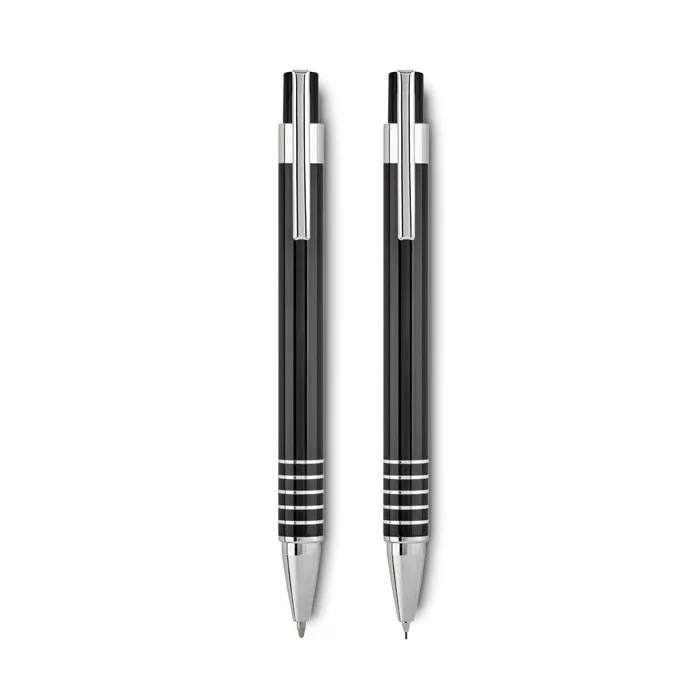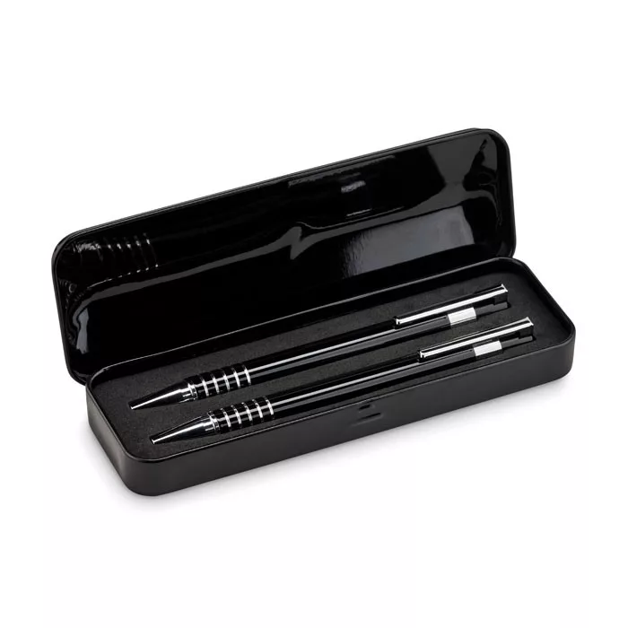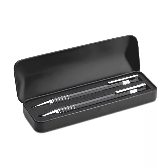Alumínium íróeszköz készlet. Tartalma: kéken író golyóstoll és mechanikus ceruza. Hozzáillő fém dobozban.