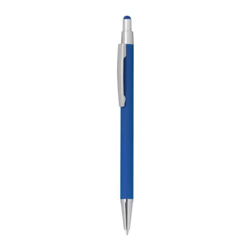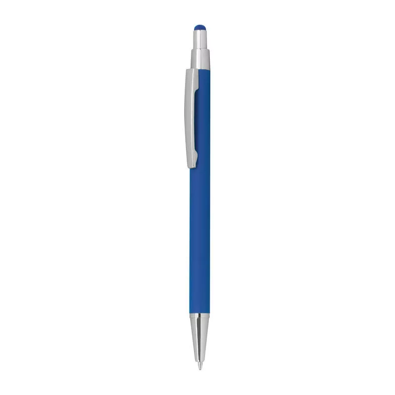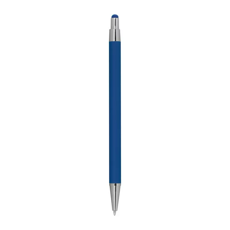 Vékonytestű, gumírozott fém golyóstoll, kék tollbetéttel és érintőképernyős funkcióval.