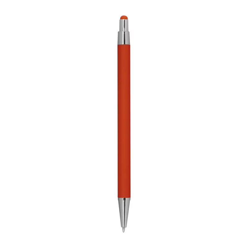 Vékonytestű, gumírozott fém golyóstoll, kék tollbetéttel és érintőképernyős funkcióval.