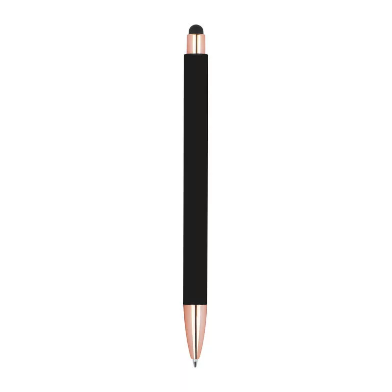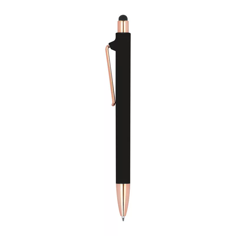 Gumírozott toll rózsaarany (rosegold) színű kiegészítőkkel, kéken író tollbetéttel, extravagáns klipsszel és érintő funkcióval.