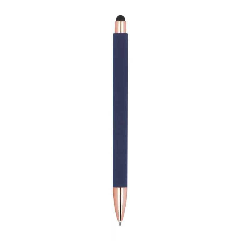 Gumírozott toll rózsaarany (rosegold) színű kiegészítőkkel, kéken író tollbetéttel, extravagáns klipsszel és érintő funkcióval.