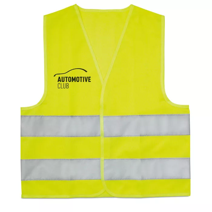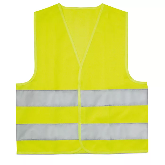 Láthatósági mellény gyerekeknek. Két fényvisszaverő csíkkal. Anyaga: 100% poliészter. EN17353.