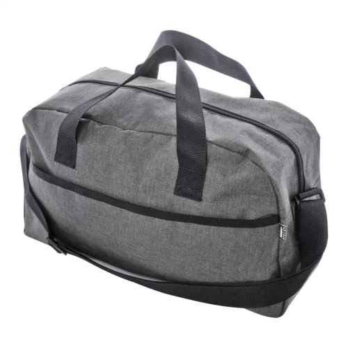 RPET sporttáska elülső zsebbel, cipzáras fő rekesszel és állítható vállpánttal. 600D RPET poliészter, megkülönböztető RPET címkével.