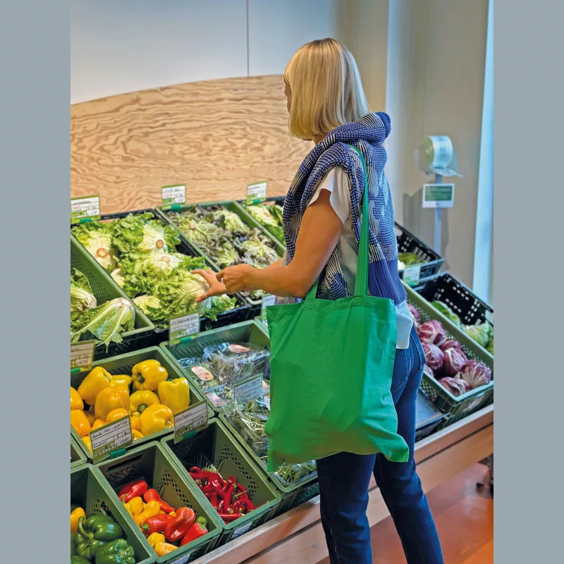 140g/m² vastagságú, tartós, környezetbarát, hosszúfülű Oeko-Tex® STANDARD 100 tanúsított bevásárlótáska 100% pamutból, sok színben.
