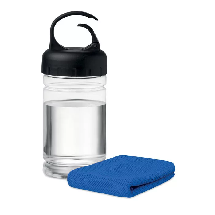 100% poliészter anyagból készült hűsítő törölköző, 300 ml űrtartalmú PET palackkal. Törülköző mérete = 30x80 cm