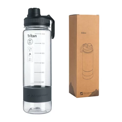 Szürke színű Schwarzwolf tritánból készült palack kényelmes gumi felülettel, fekete fedéllel és akasztható hurokkal. A palack nem tartalmaz BPA-t.