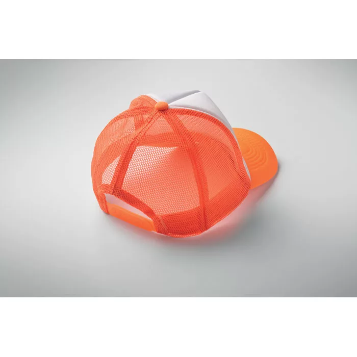 5 paneles kamionos sapka 140-150 gr/m² poliészterből, állítható műanyag záródással. Fehér elülső panel és színes napellenző poliészter jersey anyagból, szivacsos hátoldallal. A többi panel hálós anyagból. Méret: 7 1/4.