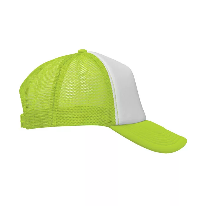 5 paneles kamionos sapka 140-150 gr/m² poliészterből, állítható műanyag záródással. Fehér elülső panel és színes napellenző poliészter jersey anyagból, szivacsos hátoldallal. A többi panel hálós anyagból. Méret: 7 1/4.