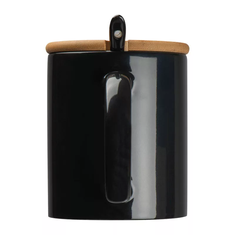 Kerámia bögre bambusz tetővel, hozzáillő kivágással a kanálnak, ami a csomag tartalma és 300 ml űrtartalommal.