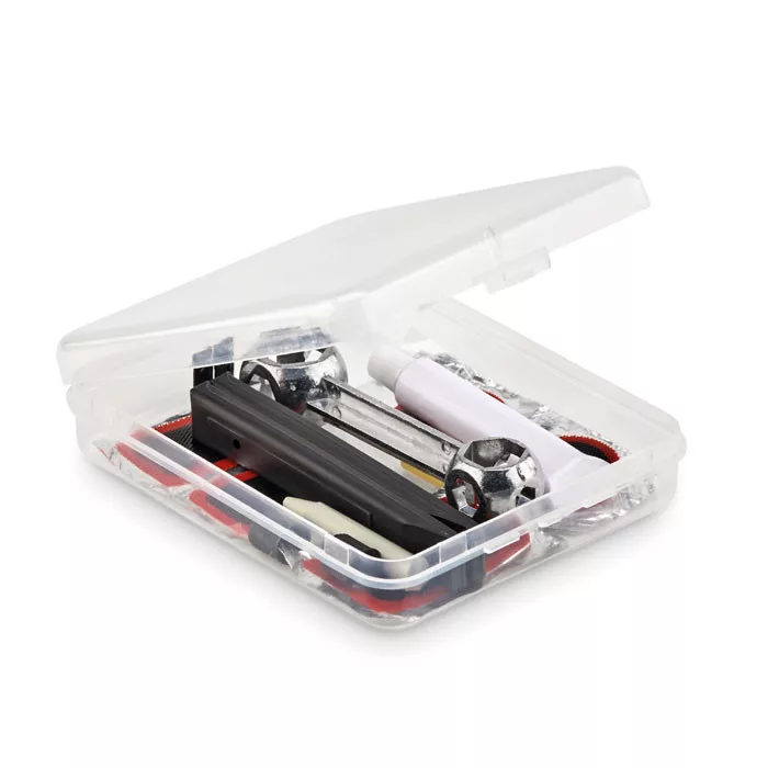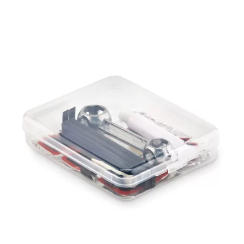 Kerékpárjavító készlet 1 csavarkulccsal, 2 gumikarral, 1 ragasztóval, 2 szelepsapkával, 2 szelepcsővel, 1 csiszolóval, 5 javítófolttal. Ezzel a szettel minden segítség rendelkezésére áll, ha kerékpárján kisebb javítást kell végeznie. Pattanjon nyeregbe újra és tekerjen tovább! Átlátszó dobozban.