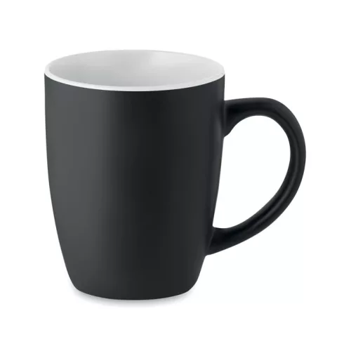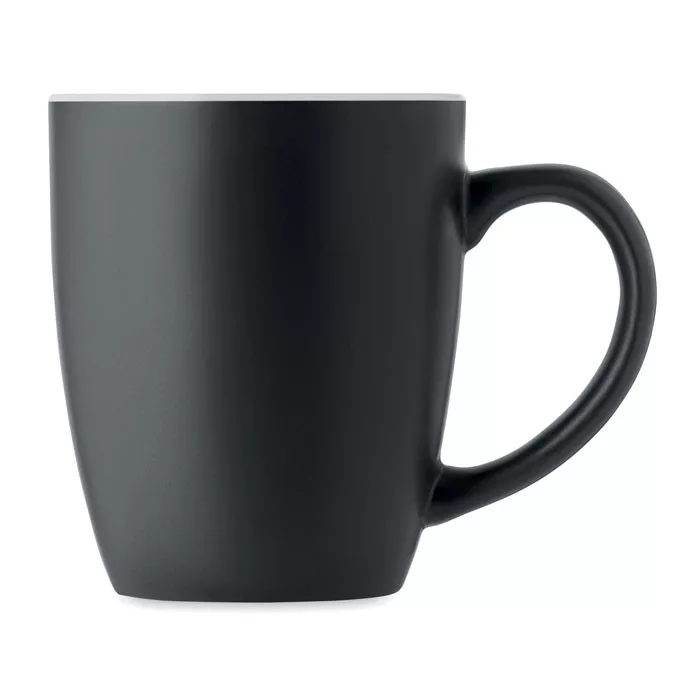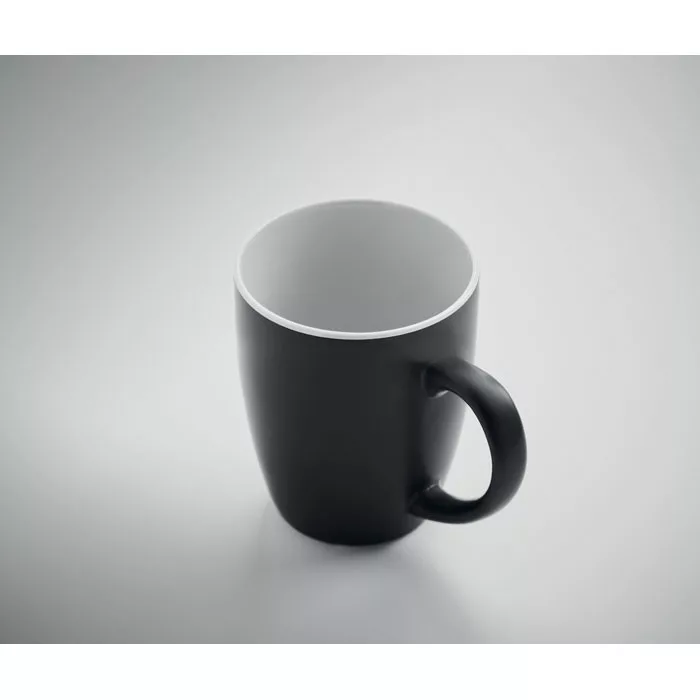 Fekete matt kerámia bögre színes fényes belső oldallal. Űrtartalom: 290 ml. Speciális bevonattal lézergravírozáshoz