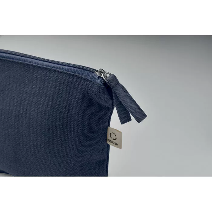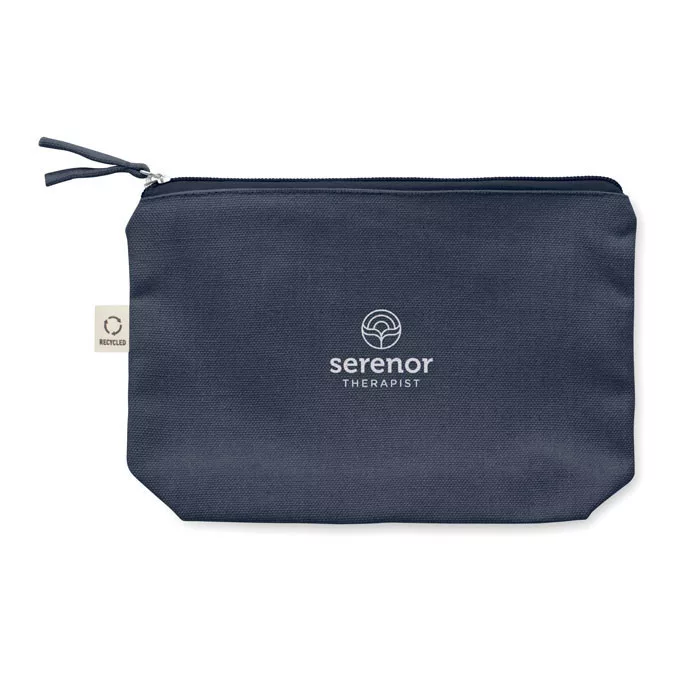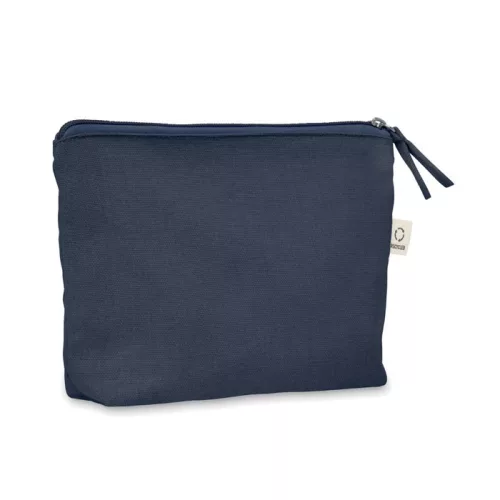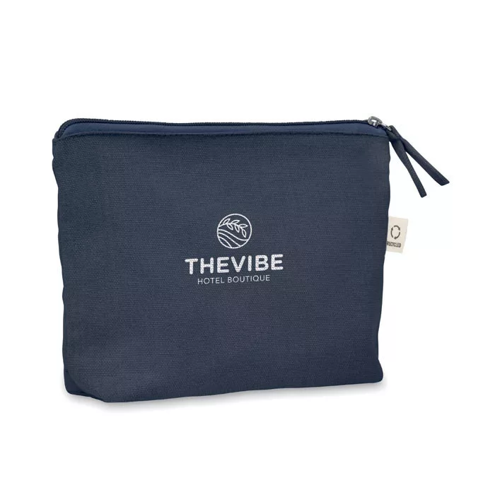 Újrahasznosított anyagból készült kozmetikai- vagy piperetáska (70% újrahasznosított pamut és 30% RPET poliészter), színazonos cipzárhúzóval. 320 g/m². Ez az anyag nyomtatás után zsugorodhat.