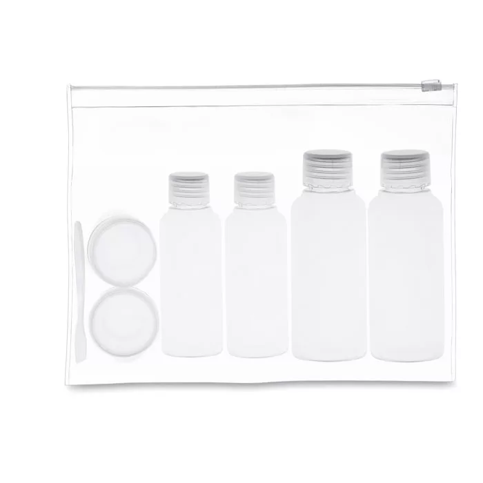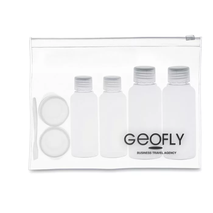 Repülőgép kompatibilis kozmetikai táska üres palackokkal (100 ml, 50 ml és 10 ml).
