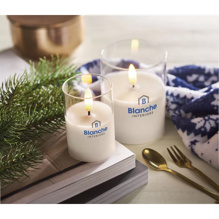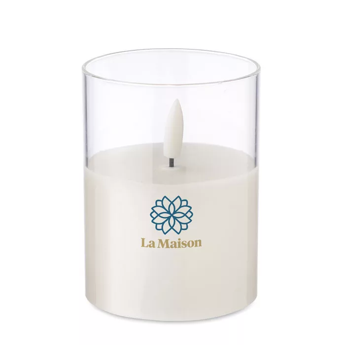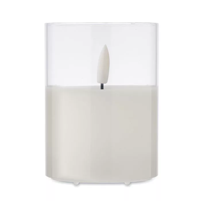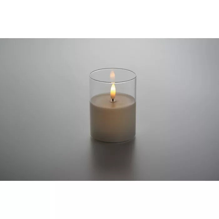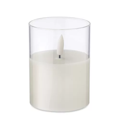 LED-es viaszgyertya üvegtartóban, valós lánghatással. 2 db AA elemmel működik, elem nélkül szállítjuk.
