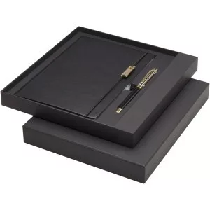 A Legato egy elegáns kombinációja egy A5 méretű jegyzetfüzetnek és egy rollerball tollnak. A toll felső része újrahasznosított rézből készült arany krómozott felülettel, az alsó része fekete/barna spray-bevonattal rendelkezik, fém arany krómozott kiegészítőkkel és egy LUXE logóval a középső gyűrűn. Fekete tollbetéttel. Íráshossz: 400 méter. Hegyméret: 0,7 mm. A jegyzetfüzet 80 lap, 80 g/m2 súlyú vonalas papírt tartalmaz, újrahasznosított műanyag borítóval, gumipántos zárral, könyvjelzőszalaggal és harmonikazsebbel van ellátva. Az elasztikus záráson arany krómozott fém kiegészítő található. Újrahasznosított kartonból készült ajándékdobozban szállítjuk.