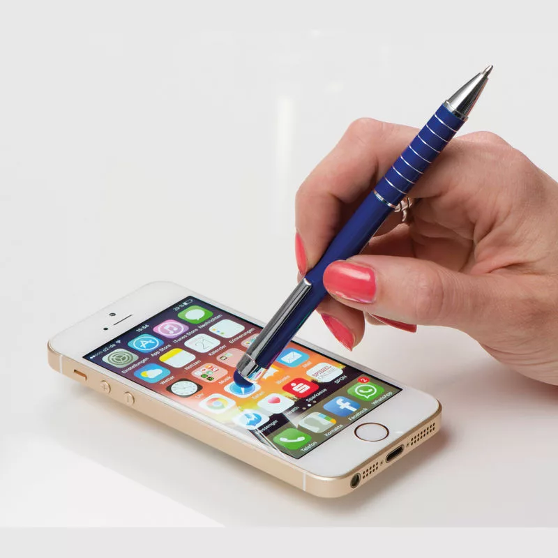Csavaros zárómechanizmussal ellátott fém golyóstoll érintőképernyős funkcióval, kék tollbetéttel és 8 díszítő gyűrűvel.