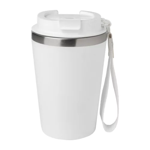 Duplafalú, újrahasznosított rozsdamentes acélból készült hőszigetelt thermo pohár, PP műanyag külsővel és ivófedéllel. RPET hordpánttal. 350 ml.